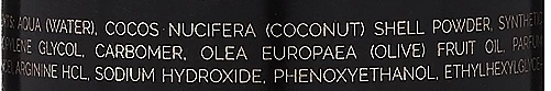 Aqua (Water), Cocos Nucifera (Coconut) Shell Powder, Hydrogenated Castor Oil, Propylene Glycol, Carbomer, Olea Europaea (Olive) Fruit Oil, Parfum (Fragrance), Arginine Hcl, Sodium Hydroxide, Phenoxyethanol, Ethylhexylglycerin