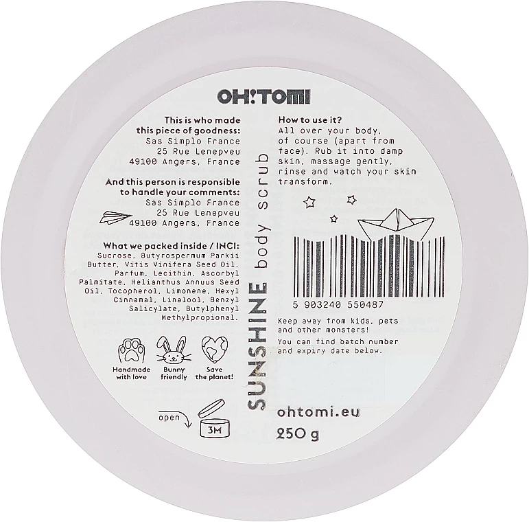 Sublimez votre peau avec le gommage Sunshine de l’entreprise italienne Oh!Tomi. A l’aide de sa formule associant des ingrédients provenant de la nature, le produit exfolie les cellules mortes de la surface cutanée et révèle une nouvelle peau revitalisée. L’association de composants bénéfiques contribue à supprimer les impuretés, à prévenir la déshydratation et à améliorer la flexibilité de la peau. La fragrance ensoleillée du gommage vous transporte sur une île paradisiaque et favorise les émotions positives. Le beurre de karité et l’huile de pépins de raisin dans la composition apportent de la douceur, protègent les cellules cutanées et fortifient leur structure.